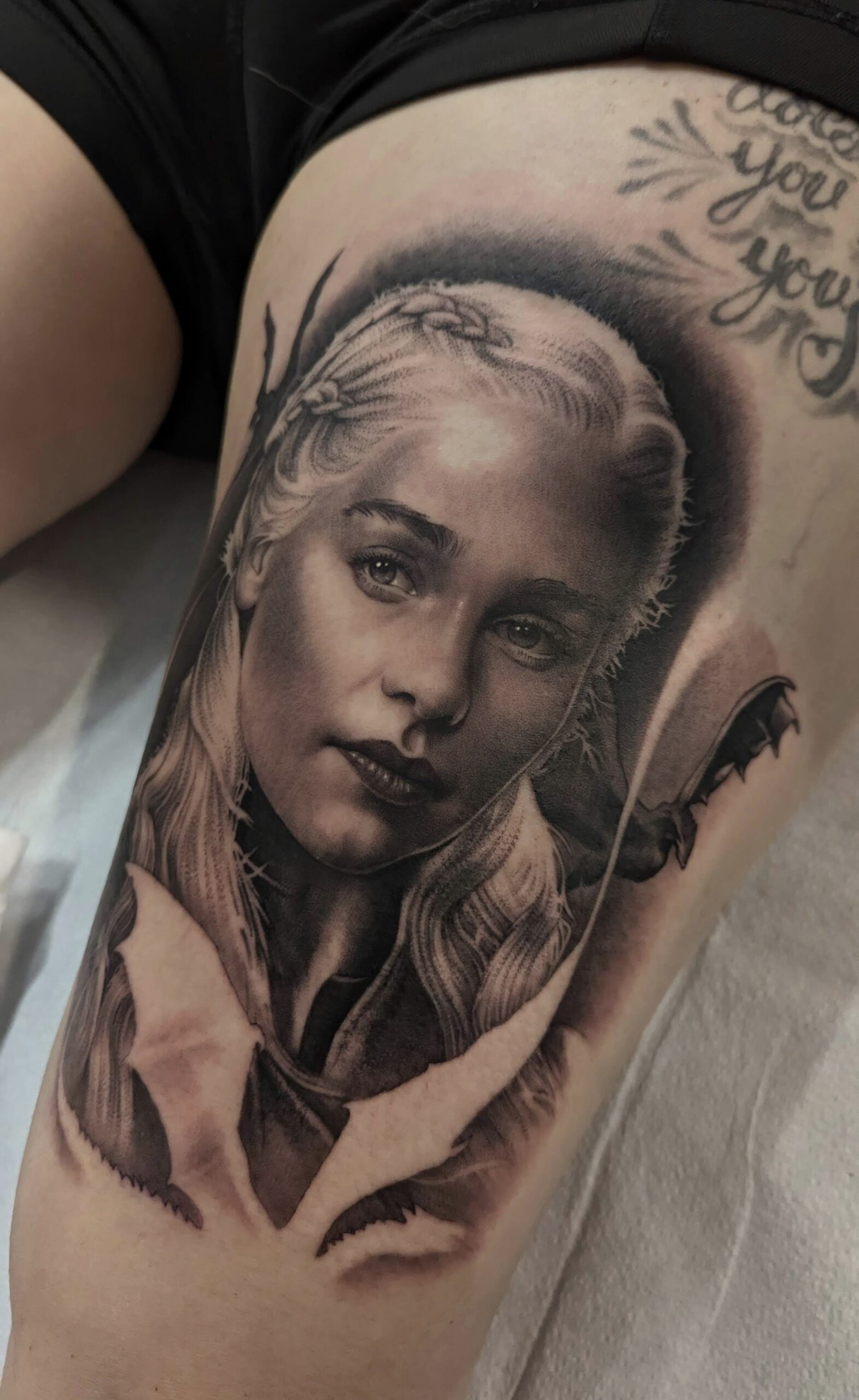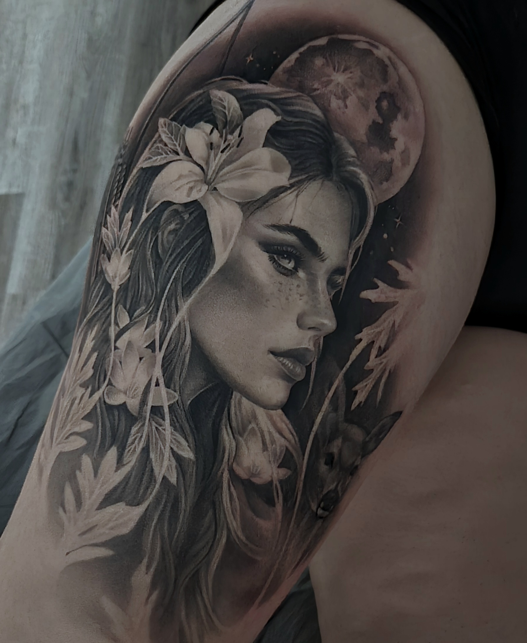 À 29 ans, elle débute le tatouage et se consacre pleinement à cet art. Aujourd’hui, avec plus de 10 ans d’expérience, Christelle est reconnue à Québec pour son travail en réalisme black & grey, et plus particulièrement en portrait, un style exigeant qu’elle maîtrise avec finesse.